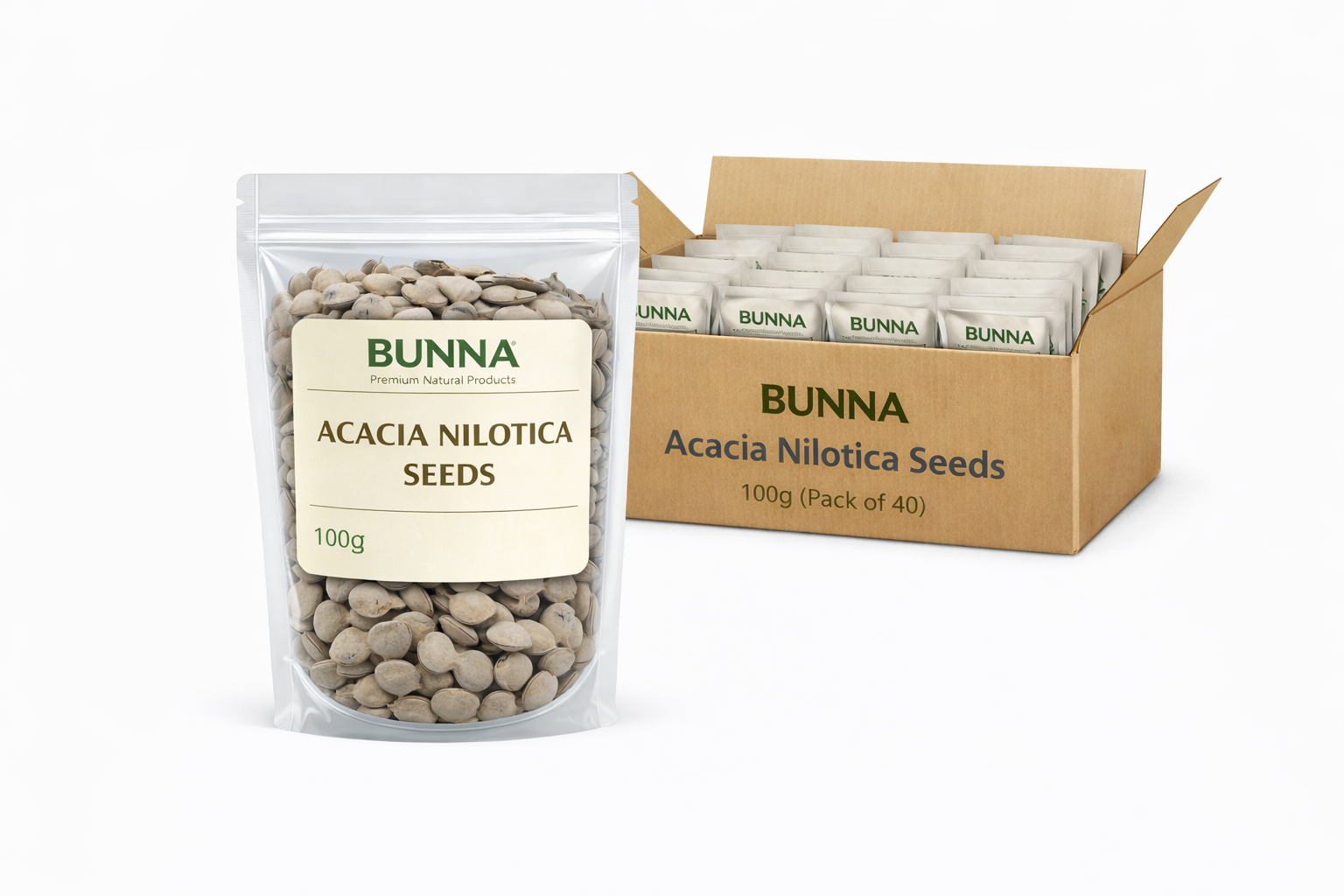 Premium dried Acacia Nilotica seeds packed in a 100g Bunna pouch. Suitable for traditional and botanical use.