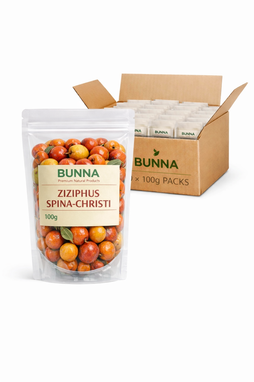 Premium dried Ziziphus Spina-Christi packed in a 100g Bunna pouch. Suitable for traditional and botanical use.